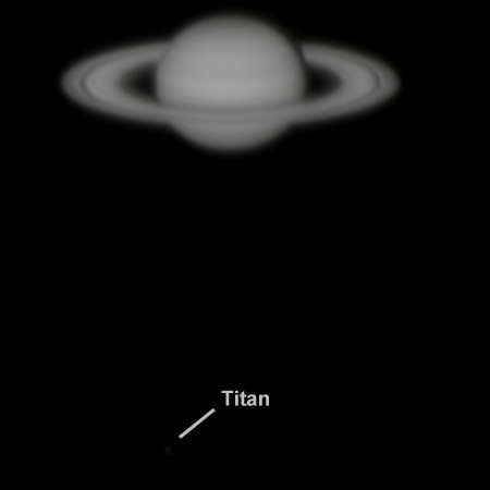 Bereits bei der Aufnahme der Videos konnte ich mit dem UV-IR Sperrfilter und dem Astronomik IR den Saturnmond Titan auf dem Bildschirm erkennen. Enceladus und Mimaß paßten zwar ins Gesichtsfeld, waren aber mit Helligkeiten jenseits von 11.5 mag dicht am Saturn nicht mehr zu erkennen...