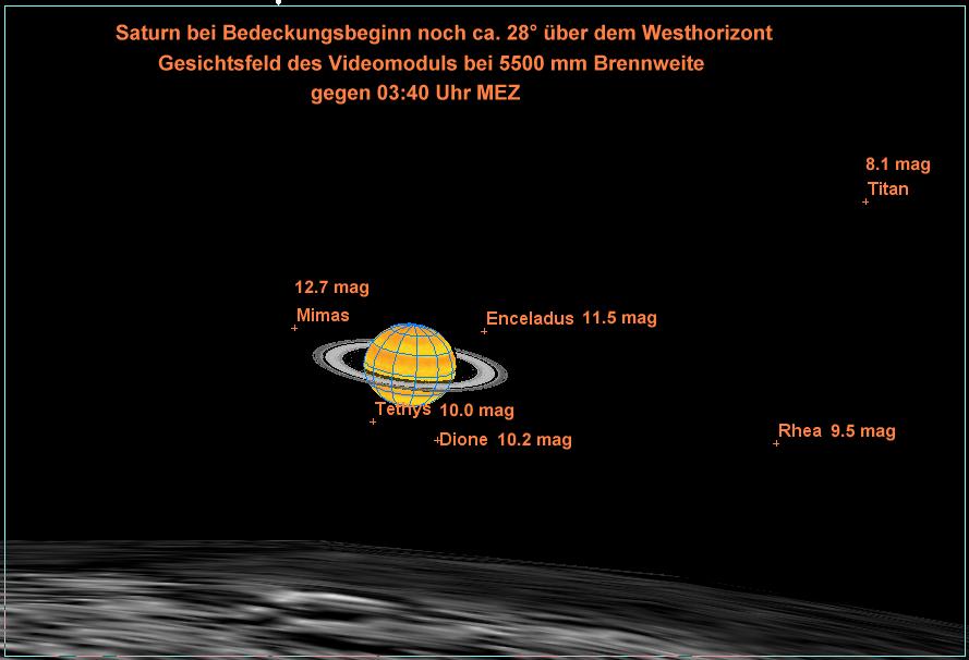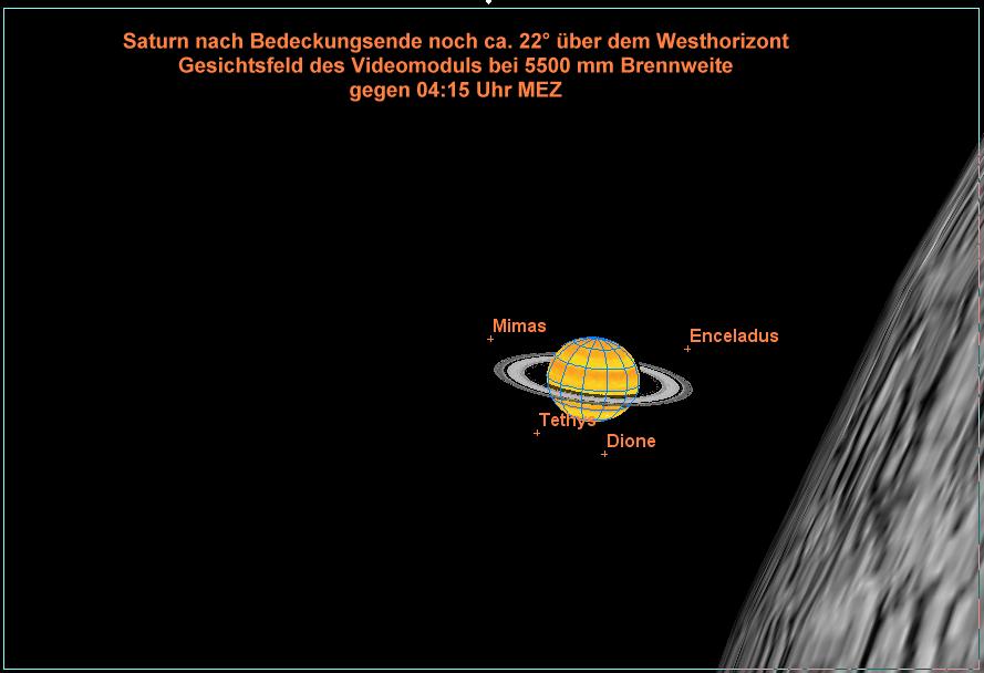 Normalerweise nehme ich Planeten nur +- 2 Stunden zur Kulminationszeit auf, da stehen sie hoch über dem Horizont und es gibt weniger Beeinträchtigungen durch das Seeing. Die Saturnbedeckung durch den Mond findet jedoch rund 4,5 Stunden nach der Kulmination statt. Saturn steht dabei schon tief im Westen und ich erwarte Seeingprobleme in 28° Höhe. Daher habe ich mich entschlossen, den IR-Durchlaßfilter #93 von B+W mit dem Videomodul zu verwenden. Der hat bei tief stehenden Planeten bis jetzt recht gute Dienste in Form von Seeingberuhigung geleistet. Unsere Atmosphäre ist für langwelliges Licht "durchsichtiger" :-))... Um auch die beiden Saturnmonde Titan und Rhea mit ins Gesichtsfeld der Kamera zu bekommen, verwende ich mit 5500 mm Brennweite eine eher moderate Vergrößerung durch Okularprojektion. Spannend wird der Austritt - erwische ich den korrekten Bildausschnitt am Mond? Zwischen Ein- und Austritt liegen rund 30 Minuten. Soooo genau läuft meine Montierung bei der langen Brennweite nicht - normalerweise muß ich spätestens alle 10 Minuten die Nachführung sachte korrigieren... Ich werde Saturn ab 3 Uhr einstellen und abstoppen, wie weit ich jeweils nach 10 Minuten korrigieren muß. Diesen Wert schreibe ich auf, bilde über die 40 Minuten bis zum Eintritt das Mittel der Korrekturen und korrigiere dann beim "Flug über den Mond" alle 10 Minuten um diesen Mittelwert...