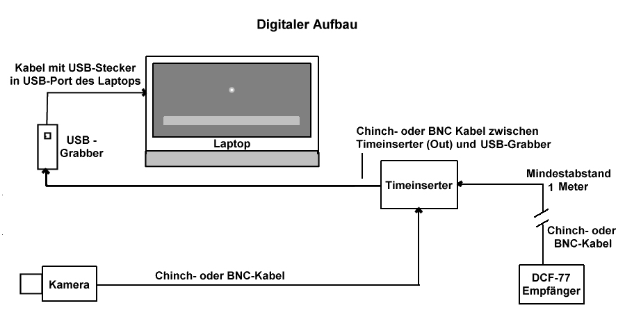 Die Kamera, der Bleigel-Akku für die Kamera, der "Kabelsalat" samt USB-Grabber, Timeinserter und DCF 77 Empfänger haben bequem in einem Alukoffer mit 40x30x15 cm Außenmaß Platz. Sogar der ultraflache Laptop paßt noch in den Koffer, und auch ein 500 mm / f = 8 Spiegelteleobjektiv. Lediglich das stabile Fotostativ muß extra getragen werden. Mit diesem Equippment kann ich Sterne bis 9 mag locker aufnehmen. Sind die Sterne dunkler, benötigt man entweder ein lichtstärkeres Teleobjektiv oder ein Teleskop mit Nachführung und mindestens 4 " Öffnung. Mit meinem 6" Newton komme ich auf eine Grenzgröße von ca. 10.5 mag... Der digitale Aufbau hat auch noch den Vorteil, daß das Kabel zwischen DCF 77 Empfänger und dem Timeinserter wesentlich kürzer werden kann. Es gibt keine Einstreuungen durch den Hochfrequenzteil des Videorecorders mehr. Somit entfällt eine Stolperfalle durch lange Kabel im Gelände :-))...