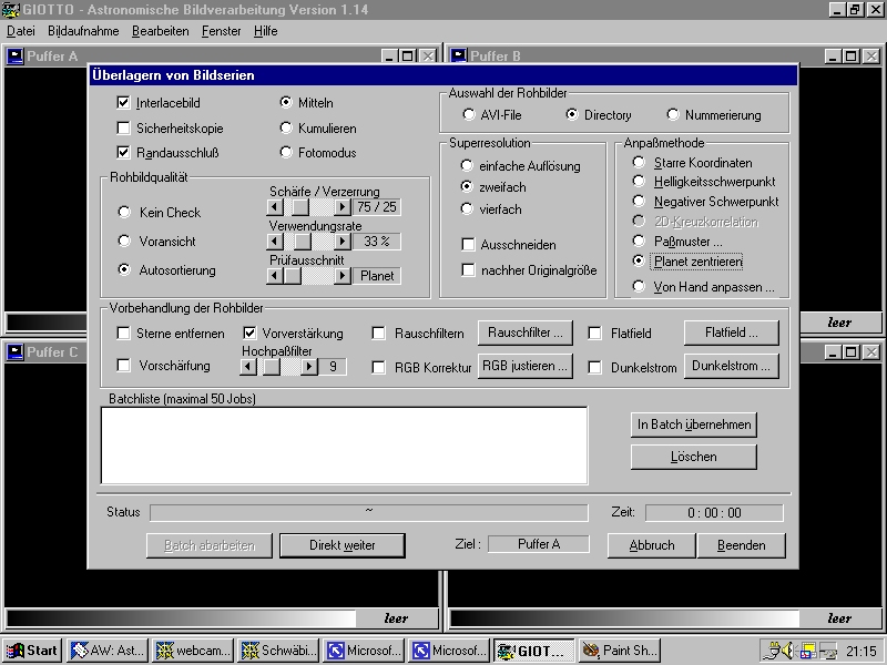 oder Sternen ca. 1200 Bilder aufnehmen. Nach der Aufnahme der Rohbilderserie oder des .avi Files sollten die