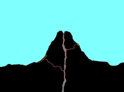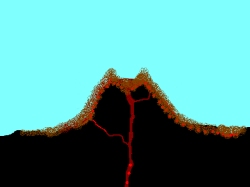 Lavastrom nach und nach, der Vulkan beruhigt sich scheinbar. Rechts: Die Lava erkaltet im Schlot und bildet einen Pfropfen, der den Schlot luftdicht verschließt. Das Auswurfgestein rund um den Vulkan erkaltet langsam, auch 10 Jahre nach einem Ausbruch sind wenige cm unter der Oberfläche noch mehrere hundert Grad Celsius zu messen. |